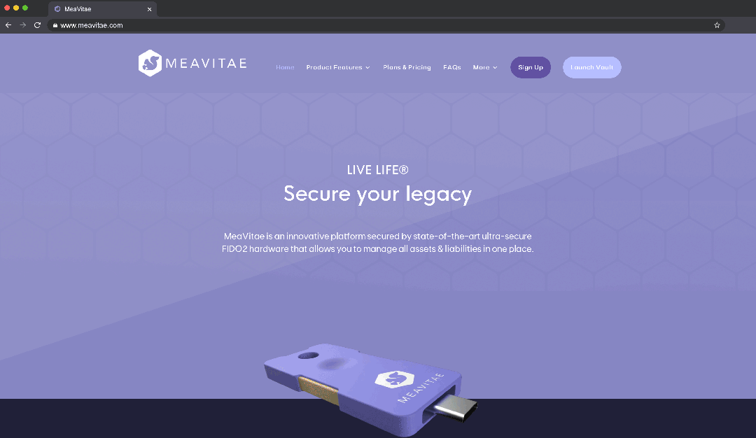MeaVitae is the key to life management. Our innovative platform is secured by state-of-the-art ultra-secure FIDO2 cryptographic hardware that allows you to manage all assets & liabilities in one completely private place.